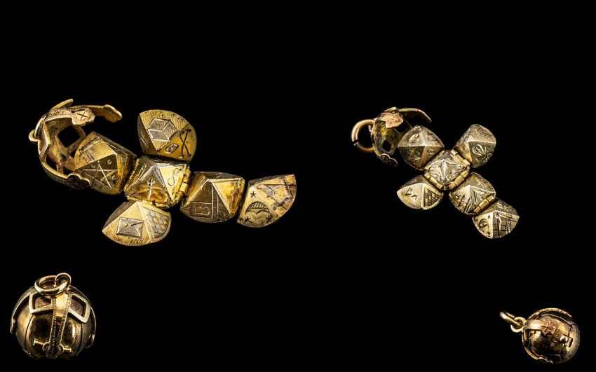 9ct Gold and Silver Masonic Ball of large size, marked 9ct and silver, 12.2g, plus a small 9ct gold and silver Masonic ball, marked for 9ct and silver, 3g; both pieces are in excellent condition (2)