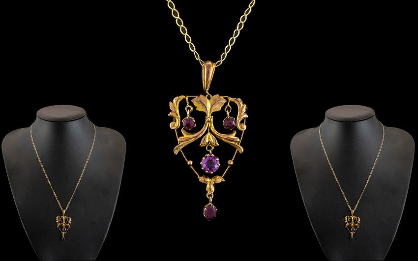 Edwardian Period 9ct Gold Openwork Pendant set with amethysts of attractive appearance, with later 9ct gold chain, marked for 9ct; chain 18 inches (45cms) long, pendant 2 inches (5cms); all aspects of condition excellent