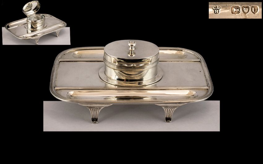 Victorian Period Superb Quality Sterling Silver Ladies or Gentleman's Desk Inkwell and Stand - Complete with Large Glass Well. Hallmark London 1895. Maker Charles Stuart Harris. 5.75 Inches - 14.50 cms Depth, 8 Inches - 20 cms Wide & 3 Inches - 7.5 cms High. 476.7 grams ( Silver Weight Only ) 15 ozs 11 grams. Wonderful Condition In All Aspects.