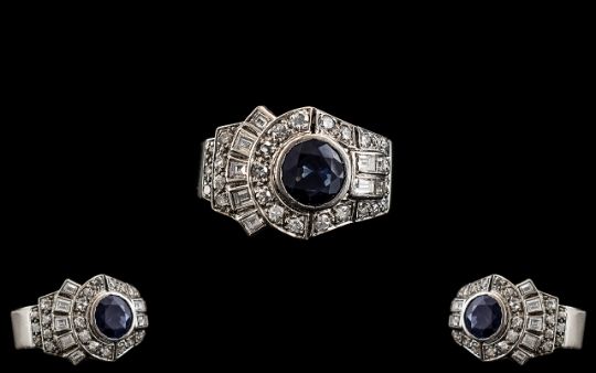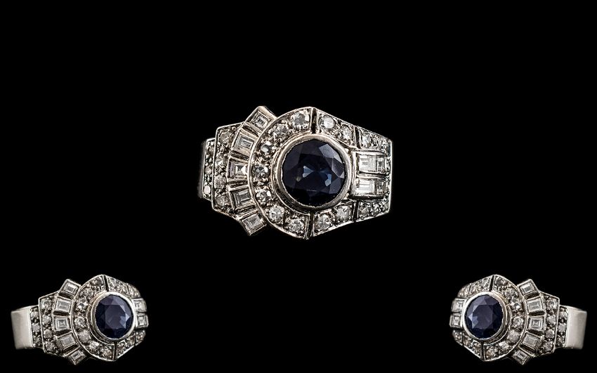 Art Deco Period Superb Platinum Diamond and Sapphire Set Cocktail Ring. The Central Blue Sapphire Surrounded by Baguette and Brilliant Cut Diamonds. The Diamonds of Good Colour / Clarity. Est Diamond Weight 1.60 cts. Blue Sapphire Est 1.00 ct. The Shank and Setting Excellent Condition. Ring Size M.