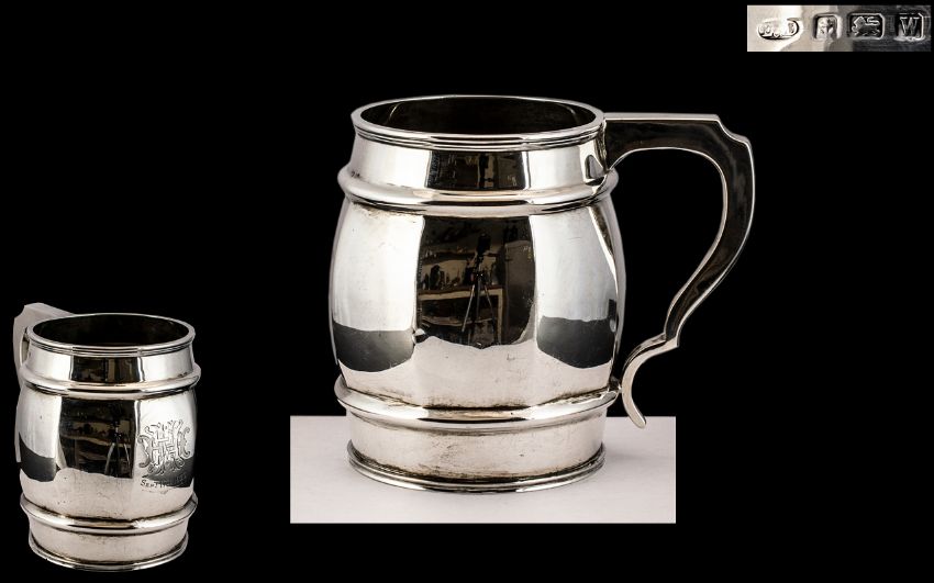 Superb Quality Early 20th Century Scarce Sterling Silver Tankard In the Form of a Barrel. Maker Ernest Duff & Co. Hallmark Birmingham 1921. Wonderful Condition and Quality. 291.00 grams - 9 ozs 12 grams. Height 4.5 Inches - 11.25 cms.