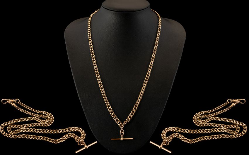 Edwardian Period Superb 9ct Gold Double Albert Chain with Attached T-Bar of Long Length. All Links Marked for 9.375 Gold. Wonderful Colour and Condition. 22 Inches - 55 cms In length. Gold Weight 45.3 grams.