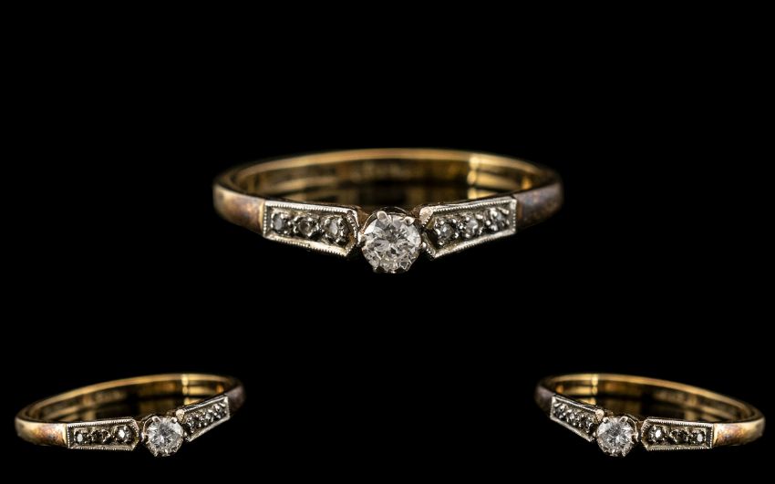 18ct Yellow Gold Single Stone Diamond Set Ring with Diamond Set Shoulders, Hallmark to Shank Interior. The Round Diamond of Good Colour and Sparkle. Ring Size - R. Good Condition Both Shank and Setting.