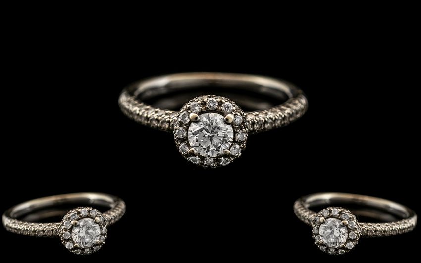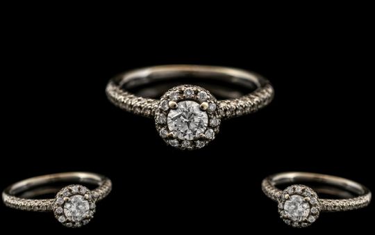 18ct White Gold - Superb and Attractive Diamond Set Dress Ring. The Central Modern Round Brilliant Cut Diamond of High Grade. Est Colour White G - H, Est Clarity VSI, Est Diamond Weight 0.40 pts, The Surrounding Diamonds Which Extend Down the Shoulders - Also of White Colour - Est Diamond Weight 0.60 pts. Approx Ring Size R - S. Shank / Setting Great Condition.