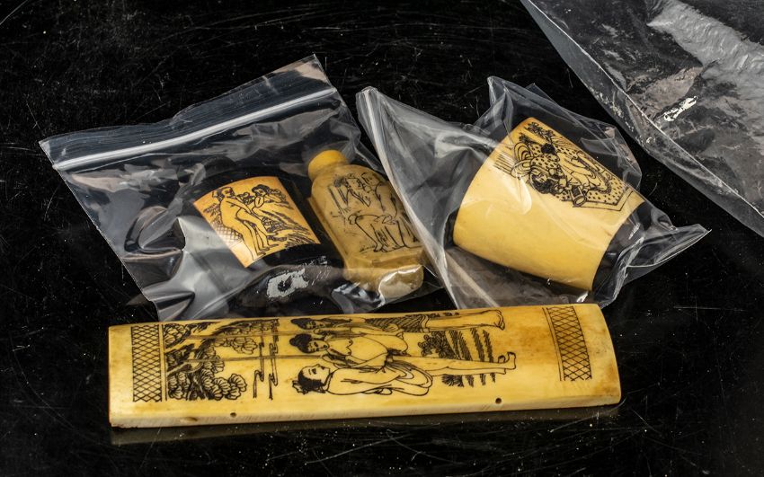 Selection of Four Man / Woman Erotic Bone Carvings, Includes Two Scent Bottles and Snuff Boxes. 20th Century Reproductions.