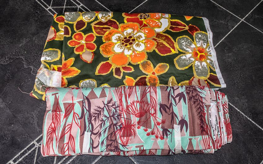 Large Collection of Fabric, comprising Dorma fabric 'Fastosun' measures 46" x 11 yards, in attractive colourway of pale green ground with red and beige leaf decoration, ideal curtain/cushion fabric. Together with Bernard Wardle 'Gavotte' fabric measuring 48" x 12 yards, in bright orange and red large floral pattern on green background, ideal for curtain/upholstery/cushion. Lovely fabric for the keen sewing enthusiast.