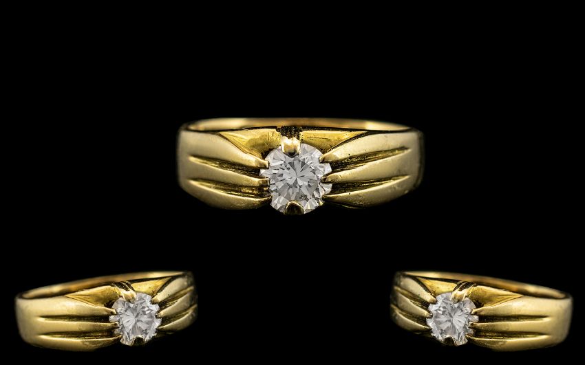 18ct Yellow Gold - Superb Single Stone Diamond Set Ring - Gypsy Setting. Marked 18ct to Interior of Shank. The Round Brilliant Cut Diamond of Top Colour / Clarity. Est Diamond Weight 0.50 pts. Ring Size P. Shank and Setting In Excellent Condition.