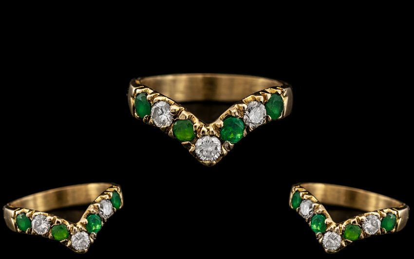 18ct Gold - Attractive Diamond and Emerald Set Wishbone of Superb Quality. The Diamonds and Emeralds of Top Colour / Clarity - White. Est Diamond Weight 0.50 pts. Est Diamond Colour G - H, VSI. Ring Size M - N. All Aspects of Condition Excellent Including Shank / Setting.