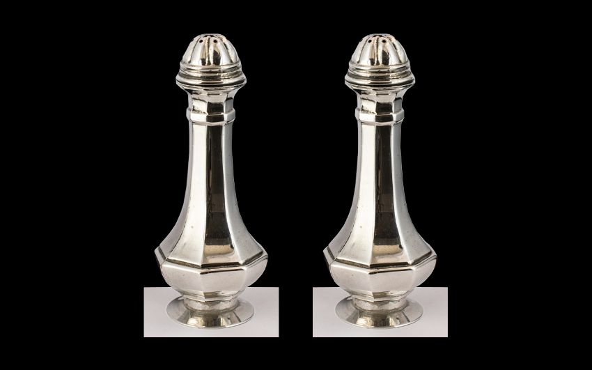 Art Nouveau - Fine Pair of Stylish Sterling Silver Pepperettes of Pleasing Form. Marked 925 Silver. 157.3 grams. Height 5 Inches - 12,5 cms. Excellent Condition - Please Confirm with Photo.