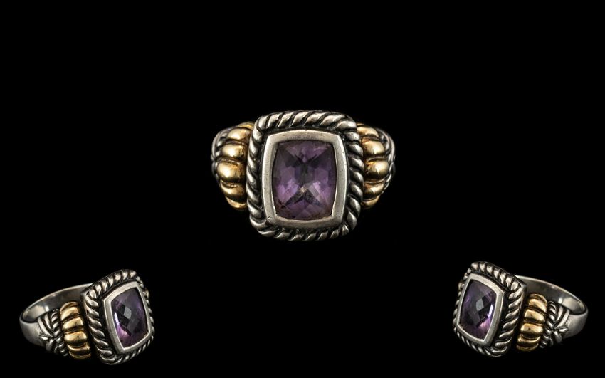 Large Amethyst Ring Set In Silver and Gold Stamped 925 & 18K. Purchased In Jamaica In 2006, Ring Size Q. Stamped Maker Samuel Benham ( BJC )