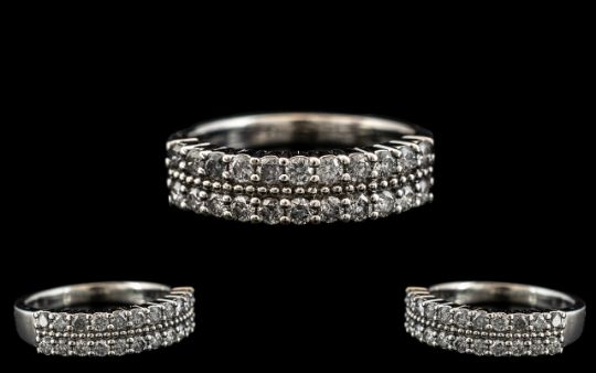 18ct White Gold Attractive Diamond Set Half - Eternity Ring. Full Hallmark for 750 - 18ct. The Round Brilliant Cut Diamonds of Top Colour / Clarity. Est Diamond Weight 0.75 pts. Ring Size O. 4.9 grams. Shank / Setting In Excellent Condition.