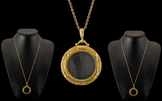Antique Period - Nice Quality 9ct Gold Circular Locket / Pendant with Attached Later 9ct Gold Chain. Both Pendant / Locket Marked for 9ct. Pendant 2 Inches - 5 cms, Chain length 24 Inches - 60 cms. 16 grams. Excellent Condition.