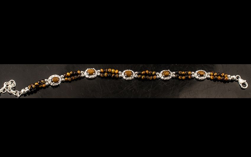 Tigers Eye Cabochon and Bead Bracelet, oval cabochons of tigers eye, set singly in silver frames, separated by double rows of small, round tigers eye beads, forming a refined version of a tigers eye bracelet, fastening with a lobster claw clasp, the whole set in silver; 7.5 inches (18.75cms) long plus 2 inch (5cm) extender chain