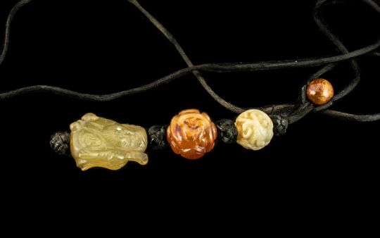 Chinese Jade Toggle of Hotei, with two carved agate beads