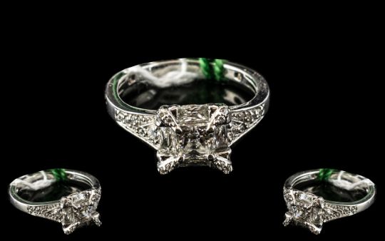 Swarovski Zirconia Set Cluster Ring, a square cut Swarovski Zirconia is supported and held in place by a selection of baguette and round cut similar stones, in an intriguing design by an unknown maker; set in platinum vermeil and silver the equivalent diamond weight would be 1.4cts; with original tag showing the stones to be Swarovski Zirconia; size S