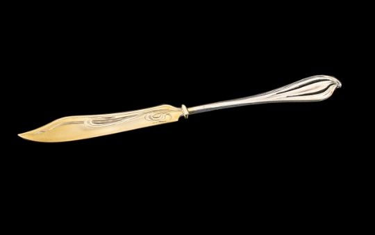 German Silver Butter Spreader, with delicate engraving to blade, and shaped handle.