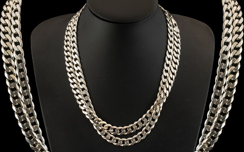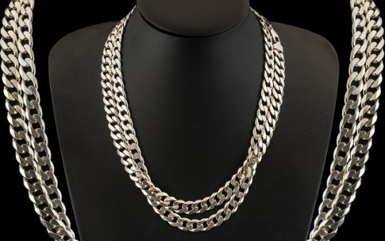 A Fine Pair of Solid and Heavy Sterling Silver Vintage Curb Design Necklaces. Both with Excellent Clasp and Both Marked 925 Silver. Lengths 19 Inches - 47.5 cms. 126.8 grams. Excellent Condition - Please Confirm with Photo.