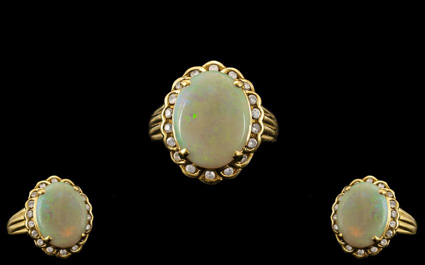18ct Yellow Gold - Attractive Opal and Diamond Set Ring with Full Hallmark for London 1993 to Interior of Shank. The Central Large Oval Shaped Opal of About 6.00 cts In Weight, Est Diamond Weight 0.60 pts. Ring Size Q - R. 8.1 grams. All Aspects of Condition As New.