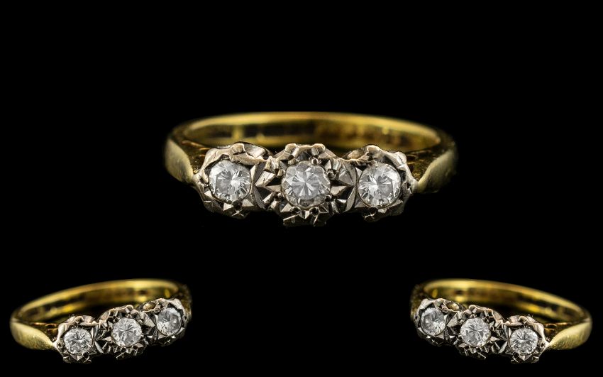 18ct Gold Illusion Set 3 Stone Diamond Set Ring. Full Hallmark 750 18ct to Interior of Shank. Ring Size I. Condition of Shank / Setting Good. 3 grams.