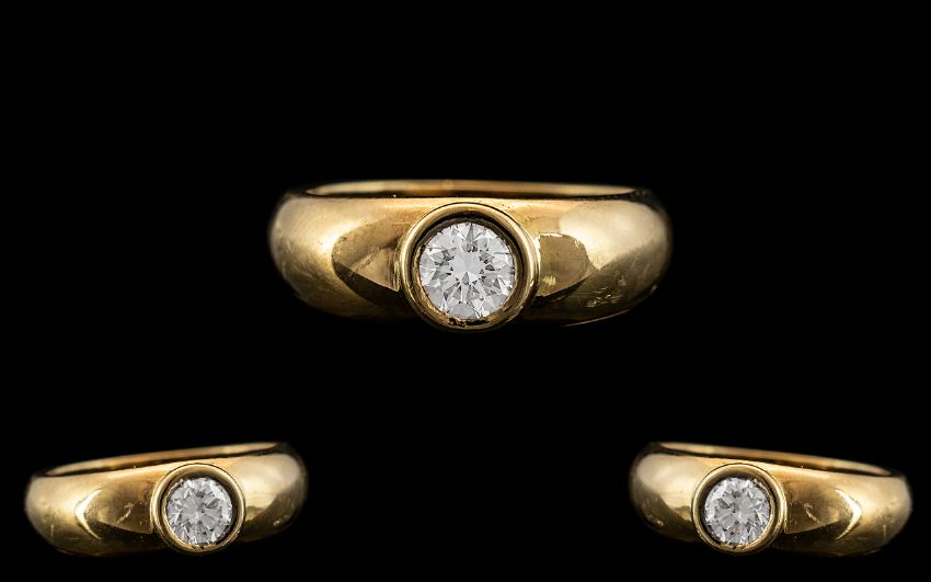 18ct Yellow Gold - Superb Single Stone Pave Set Diamond Ring. The Round Brilliant Cut Diamond of Top Colour and Clarity. Est Diamond Weight 0.50 pts. Ring Size O. Gold Weight 7.7 grams. Both Shank and Setting In Excellent Condition.