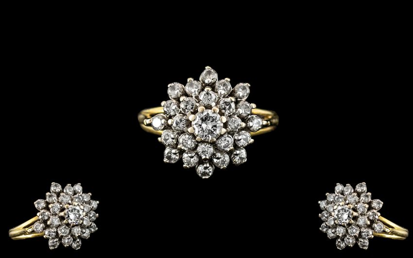 18ct Gold - Attractive Diamond Set Cluster Ring - Flower head Setting. The Diamonds of Good Colour and Clarity. Diamond Weight 1.00 ct, Marked to Interior of Shank. Ring Size I. 4.3 grams. Shank / Setting In Excellent Condition.
