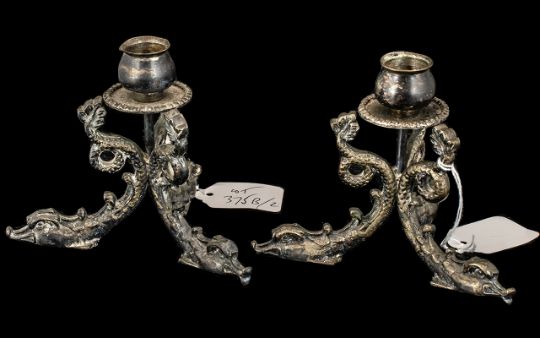 Pair of Quality Heavy Cast Metal Silver Plated Candlesticks, on tripod legs in the shape of dolphins (2)