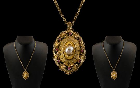 Ladies 9ct Gold - Attractive Ruby and Pearl Set Ornate Pendant From the 1970's of Pleasing Design and Form. With Attached 9ct Gold Belcher Chain with Full Hallmark to Pendant and Chain. 20 Inches - 50 cms In length, Including 2 Inches - 5 cms Pendant Size. 15.7 grams. Wonderful Full Condition Both Chain and Pendant.