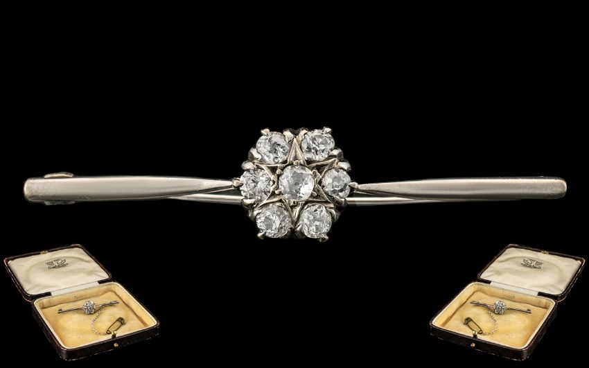 Antique Period - 18ct White Gold Attractive Diamond Set Brooch with Safety Chain. The Central Cluster of Semi-Cushion Cut Diamonds In a Flower head Setting. Excellent Clarity and Colour. Est Diamond Weight 1.00 cts. 2 Inches - 5 cms Wide.