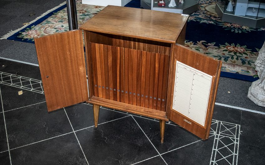 Unusual 1960s Record Cabinet with fitted LP compartments 1 - 18 with walnut and teak inlaid to the front and doors; made by Arnold, 28 inches (70cms) high x 21 inches (52.5cms) wide x 16 inches (40cms) deep
