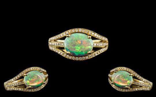 18ct Gold - Attractive Diamond and Opal Set Ring, Excellent Opal with Strong Colours, The Diamond Shoulders and Surround of Excellent Colour / Clarity. Est Diamond Weight 1.00 cts. Ring Size N - O. Shank / Setting Superb Condition / As New.