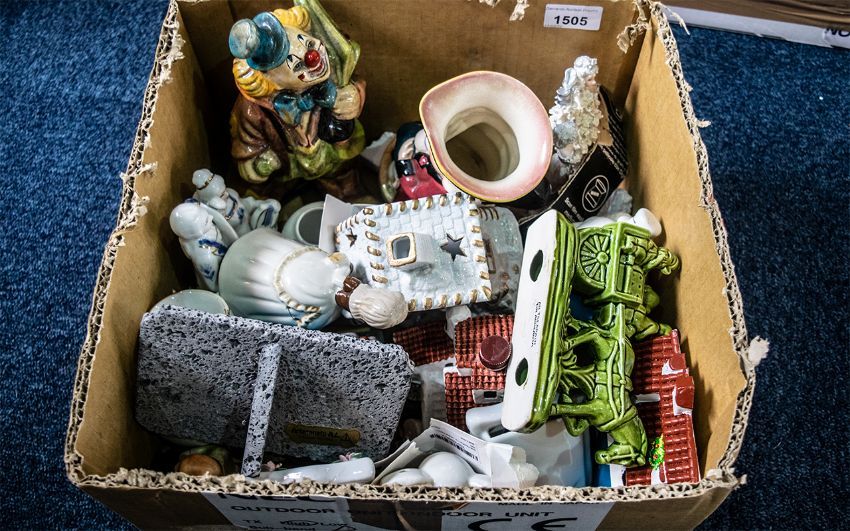 Box of Assorted Pottery & Porcelain, comprising Burlington Ware Toby Jug, clown figure, various figurines, Christmas tea light holder, animal figures, vases, etc.