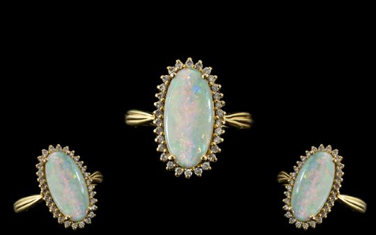 18ct Gold Attractive Opal and Diamond Set Dress Ring full hallmark for 750 to interior of shank. The oval shaped opal of excellent colours. Estimated 3.50cts surrounded by 40 diamonds. Ring size S. Shank and setting in excellent condition.