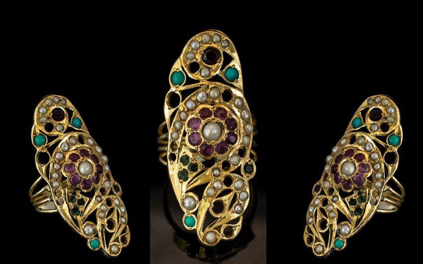 Ladies 18ct Yellow Gold Handmade Multi-Stone Set Statement Ring of Elongated Design, Set with Rubies, Emeralds, Seed Pearls and Turquoise. Marked 18ct. Ring Size N. Weight 6.0 grams. Good Condition - But Please Note 6 Seed Pearls are Missing - Please Confirm with Photo.
