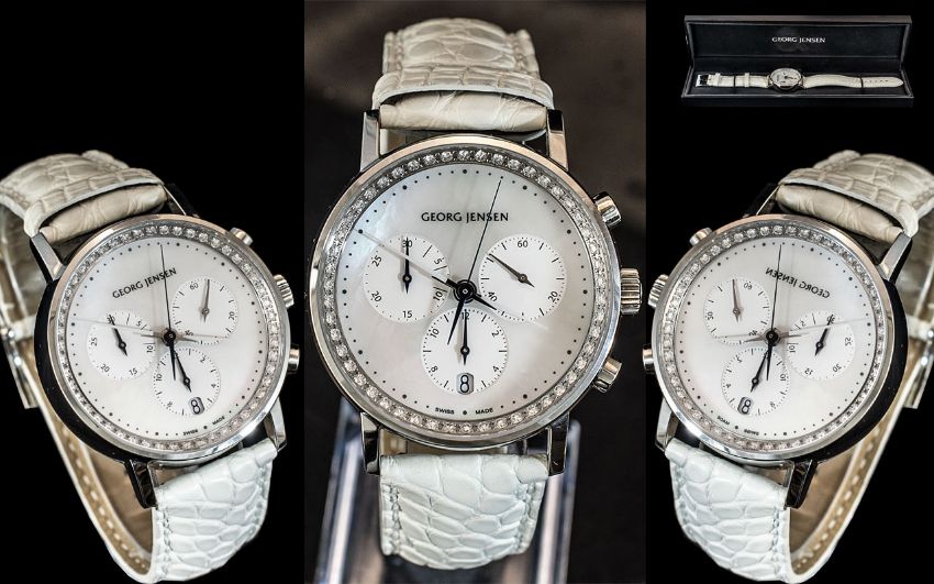 Georg Jensen Superb Ladies Steel Cased Chronograp ( Multi-Dial ) Diamond Set Wrist Watch. Model No 000388. Designer Henning Koppel Set with 50 Brilliant Cut Sparkling Wesselton Diamonds to Bezel. Total Diamond Weight 0.71 cts. Also Fitted with White Calfskin Strap with Mother of Pearl Dial. Dial 38 mm Diameter. With Georg Jensen Watch Display Box.