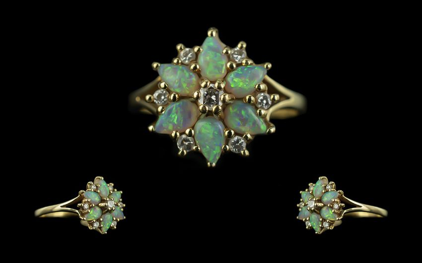 Ladies Attractive and Good Quality 18ct Gold Opal and Diamond Set Dress Ring. Exquisite Design and Setting. Full Hallmark to Interior of Shank. Hallmark London 1981. The Well Matched Teardrop Opals of Excellent Colour, with Diamond Set Spacers. Ring Size O. Weight 4.5 grams. Shank / Setting Very Good Condition.