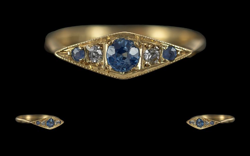 Edwardian Period - Attractive and Exquisite 18ct Gold Blue Sapphire and Diamond Set Dress Ring, Excellent Setting. Hallmark Birmingham 1912, The Blue Sapphires of Excellent Colour with Old White Diamond Spacers. Ring Size Q. Weight 2.1 grams.