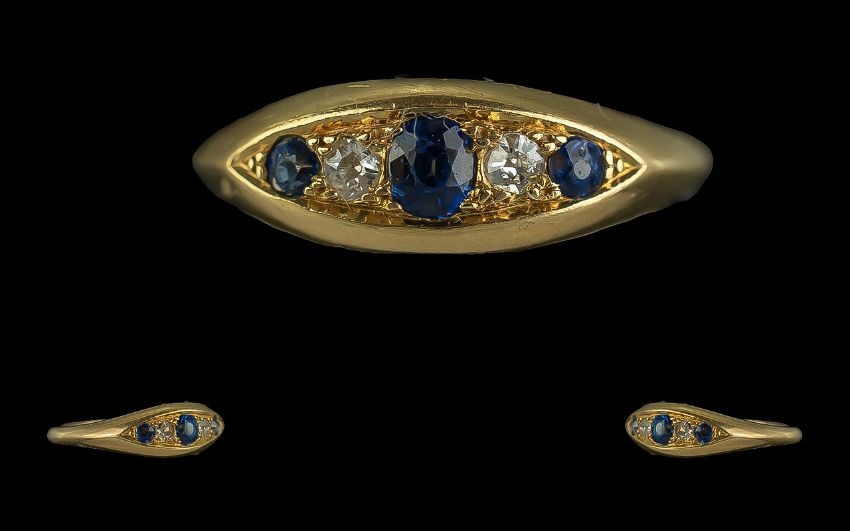 Antique Period 18ct Gold - Blue Sapphire and Diamond Set Ring. Full Hallmark for London 1912 To Interior of Shank. The Sapphires and Diamonds of Good Colour / Clarity. Ring Size N. Weight 3.9 grams. Very Good Condition.