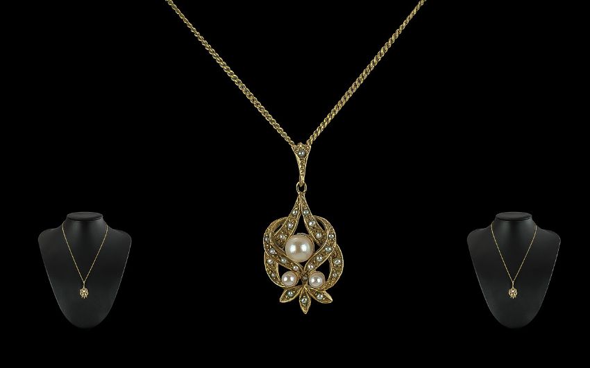 Ladies - Attractive 9ct Gold Pearl Set Open-worked Pendant, Attached to a 9ct Gold Chain. Both Pendant and Chain Marked for 9ct Gold. Weight 6.3 grams. Length 20 Inches - 50 cms.