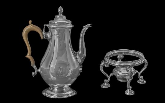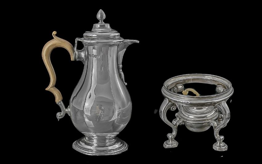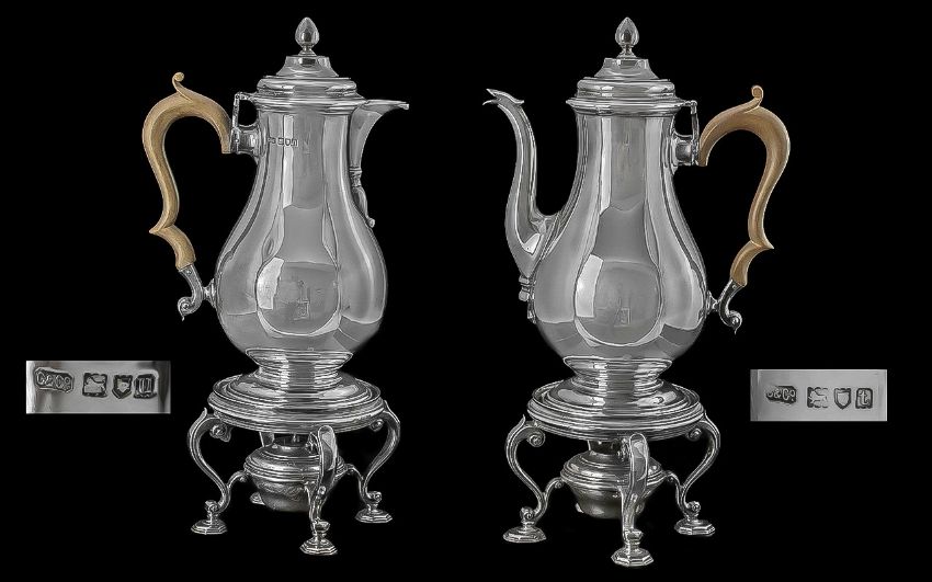 George V - Impressive and Superb Quality Sterling Silver Pair of Matching Coffee Pot and Water Jug with Spirit Stands of Large Proportions. Hallmark London 1915, Maker C & Co ( Carrington & Co ) Silver Weight 106 ozs. Each with Stand Spirit, Size 14.5 Inches - 36.5 cms. Both Water Jug and Coffee Pot, And the Stands In Excellent Condition - Please Confirm with Photo. Commission on This Lot Is 10%.