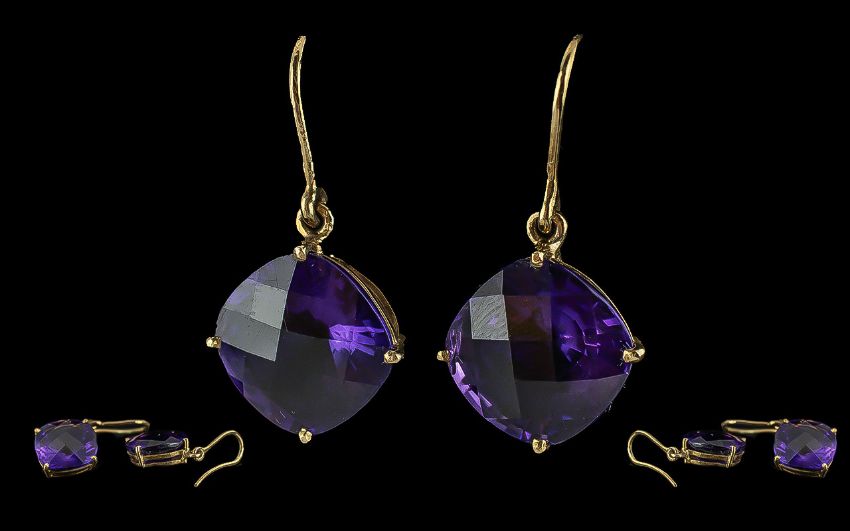 Ladies 9ct Gold Excellent Quality Single Stone Amethyst Set Earrings. marked 9ct. the large faceted amethysts of excellent colour / clarity. each amethyst weighs est 8.00 cts ( 16 cts ) in total. drop 1.25 inches - 3.15 cms.