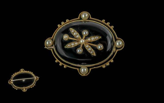 Victorian Period 15ct Gold Black Enamel and Seed Pearl Set Brooch. Marked 15ct. The Brooch In Very Good Condition. Weight 10.1 grams. Size 1.5 Inches - 3.75 cms Diameter.