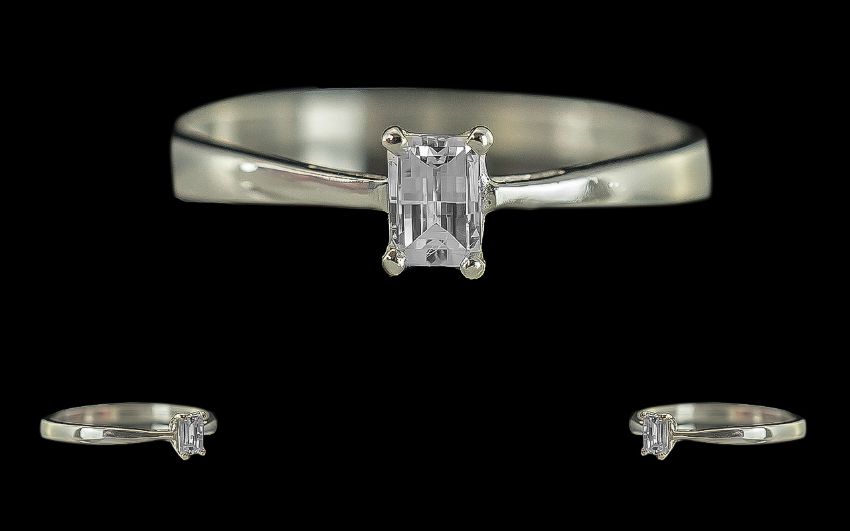 Ladies 18ct White Gold Single Stone Diamond Set Ring. Full Hallmark to Interior of Shank. The Step-cut Diamond of Top Colour / Clarity. Est F - G Colour, Diamond Weight Est 0.25 pts. Ring Size O. Weight 2.1 grams.