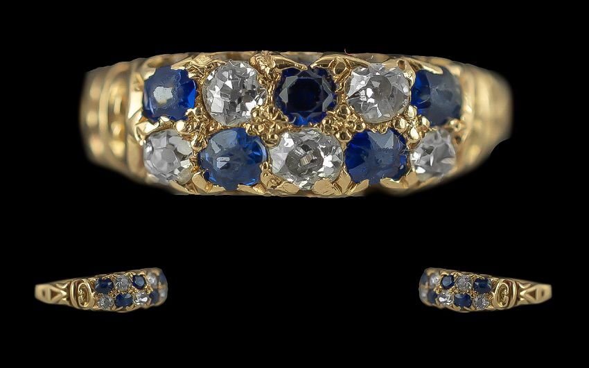 Late Victorian Period 18ct Gold Sapphire and Diamond Set Ring, Excellent Setting. Hallmark Birmingham 1880. The Blue Sapphires of Excellent Colour, Old Cut Diamonds of Good Colour. Ring Size O. Weight 3,3 grams. Sharp Hallmarks.