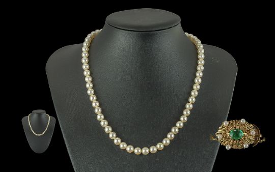 Fine Quality Single Row Cultured Pearl Necklace with Knotted Stringing and 14ct Gold Push Large Fastener, Set with Cabochon Cut Emerald and Pearls of Large Size, Comprising 57 x 7 mm, Cultured Pearls of Excellent Lustre, Length 45 cms, With Valuation Dated 18-7-00, For the Sum of £685.00 pounds.