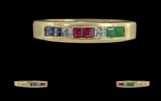 Ladies 18ct Gold Emerald, Sapphire, Ruby and Diamond Set Ring. Marked 18ct to Interior of Shank. The Emerald, Rubies, Sapphires and Diamond Also of Good Colour and Clarity. Ring Size P. Weight 4 grams.