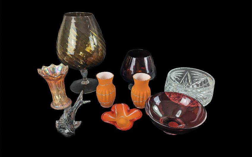 Box of Assorted Glassware, including a carnival glass vase, two orange vases, a red glass fruit bowl, a large red glass brandy glass, and a dolphin figure.
