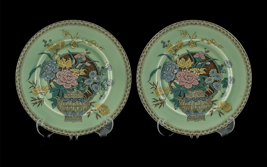 Pair of Clarice Cliff 'Ophelia' Newport Cabinet Plates, green background with a basket of flower decoration. 10" diameter. Fully marked to base.