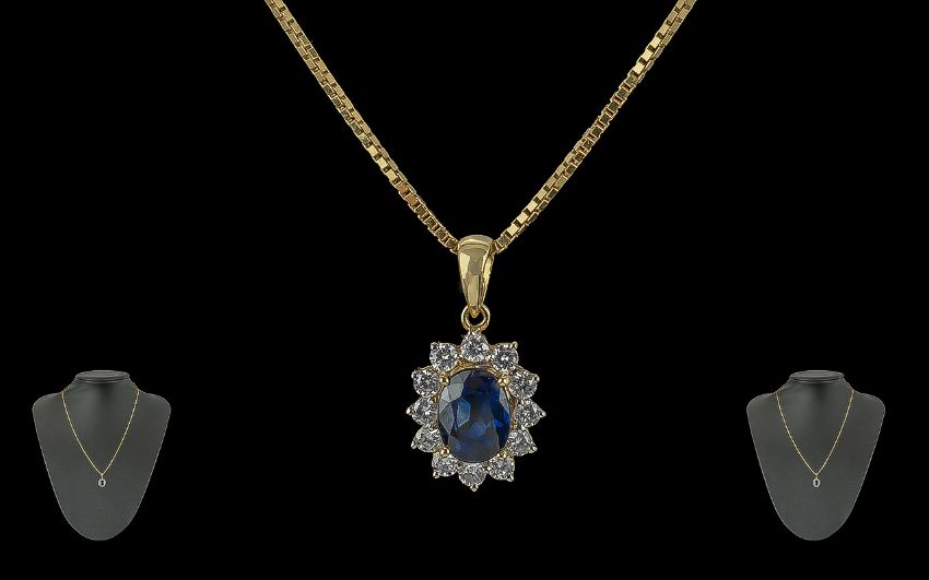 Ladies Attractive 18ct Gold Superior Quality Blue Sapphire and Diamond Set Cluster Pendant, attached to an 18ct gold quality chain, both marked 750 for 18ct, the 12 brilliant cut diamonds of top colour and clarity, est.diamond weight 0.50pts, the blue sapphire of excellent colour, est.sapphire weight 1.25cts, length 19 inches (47.5cms), weight 5.8g,