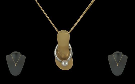 Ladies Contemporary Design Quality 18ct Gold Diamond and Pearl Set Pendant in the form of a ladies shoe, attached to an 18ct gold chain, both chain and pendant stamped 750 - 18ct; length 17 inches (42.5cms), weight 6.2g,