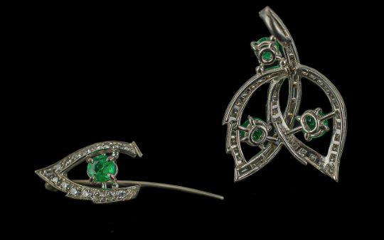 Ladies 1930's Superb and Exquisite 18ct White Gold Diamond and Emerald Set Pendant with matching 18ct white gold emerald and diamond set wishbone stick brooch, not marked, tests high ct gold, the emeralds of superb colour, the baguette and brilliant cut diamonds of good colour and clarity, est. weight of emerald 2.00cts, est.diamond weight 1.5cts, weight 7.3g, size of pendant 1.25 inch (3.12cms) high